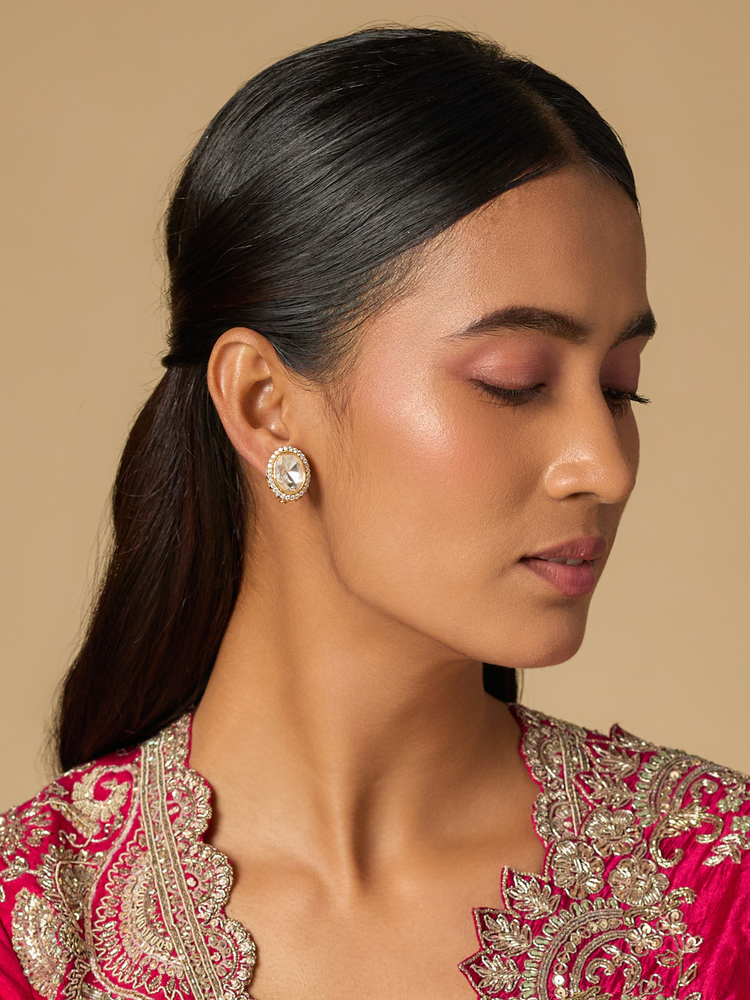 Our earrings are handcrafted in silver and plated with 22 karat gold. Our earrings are 925 silver stamped and are nickel free (non allergic). We use superior quality Moissanite polkis in our earrings. Our earrings are considerably light weight, but some of the heavier pieces have an ‘Omega Clip’ at the back for additional support. We also provide a pair of complimentary washers along with the purchase. The piece is plated with superior quality 22 karat gold polish, which means that under proper care, the polish can last up to 5-7 years.